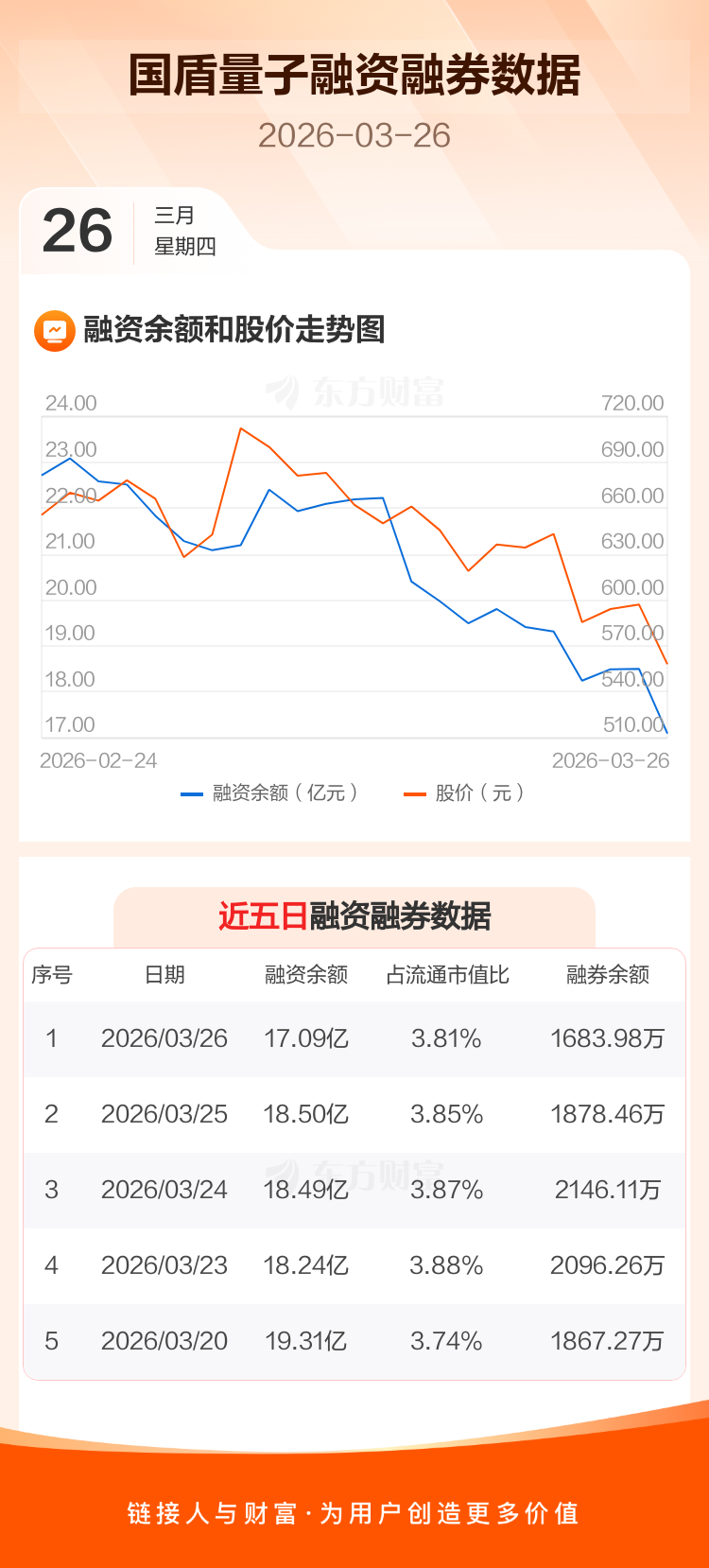 交易所最新数据显示,国盾量子于2026年3月26日获融资买入1.10亿元,融资偿还2.51亿元,当日融资净偿还1.41亿元。目前,该股融资余额17.09亿,占流通市值比例为3.81%。