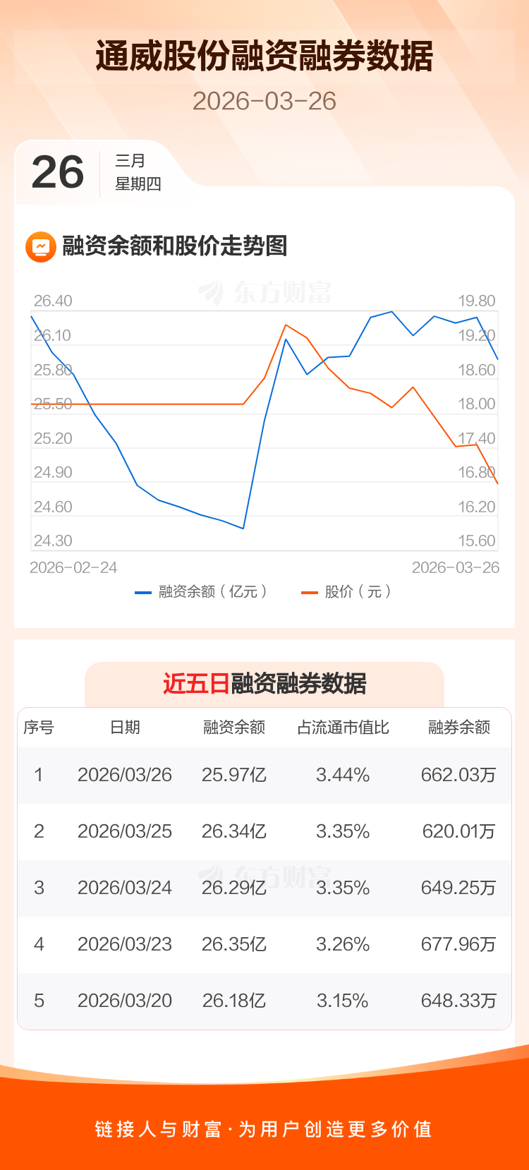 交易所最新数据显示,通威股份于2026年3月26日获融资买入8328.82万元,融资偿还1.21亿元,当日融资净偿还3734.41万元。目前,该股融资余额25.97亿,占流通市值比例为3.44%。
