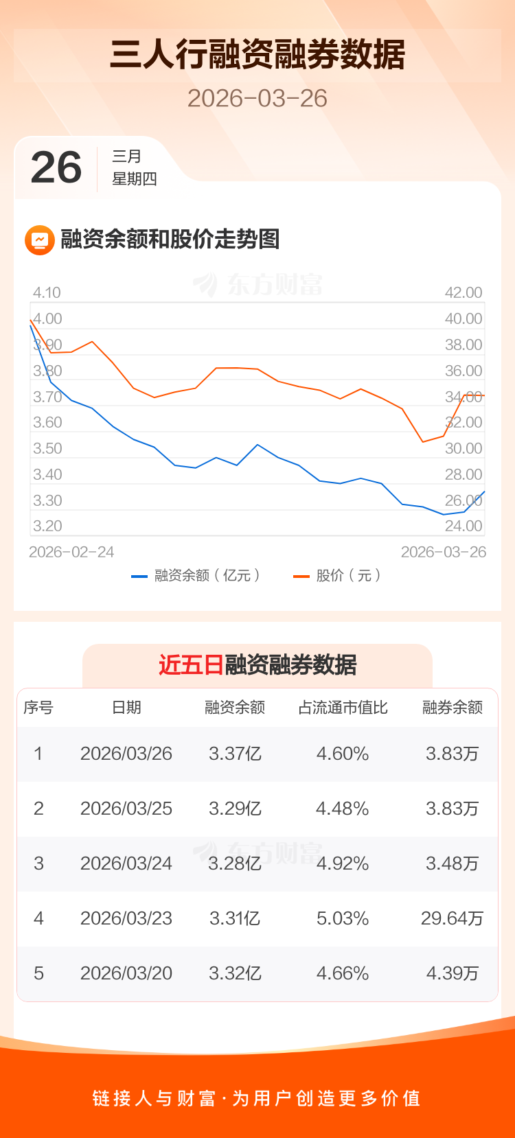 交易所最新数据显示,三人行于2026年3月26日获融资买入2113.72万元,融资偿还1321.21万元,当日融资净买入792.52万元。目前,该股融资余额3.37亿,占流通市值比例为4.60%。