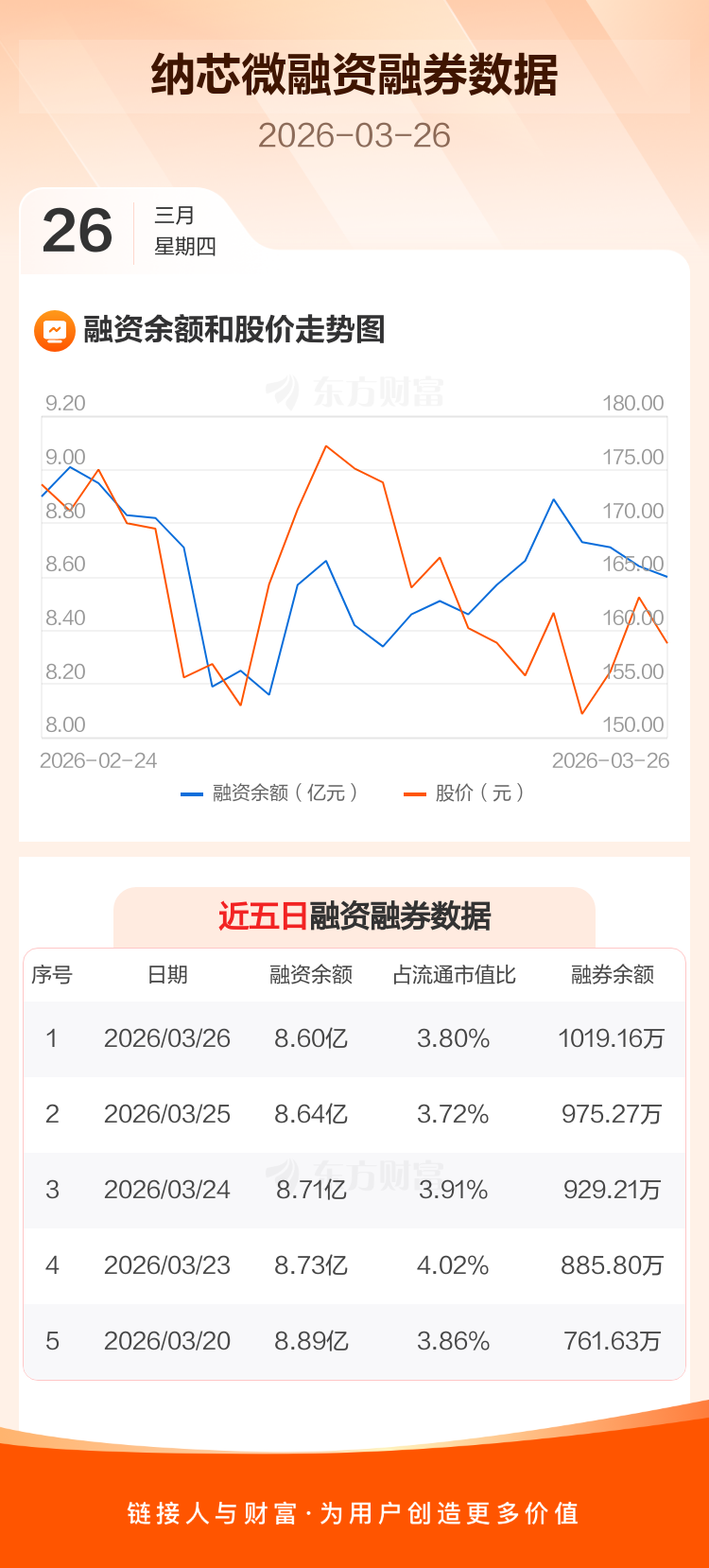 交易所最新数据显示,纳芯微于2026年3月26日获融资买入1367.51万元,融资偿还1835.81万元,当日融资净偿还468.31万元。目前,该股融资余额8.60亿,占流通市值比例为3.80%。