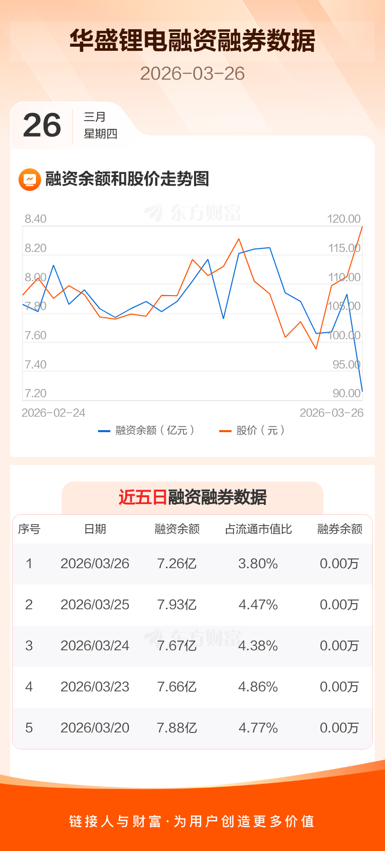 交易所最新数据显示,华盛锂电于2026年3月26日获融资买入1.71亿元,融资偿还2.38亿元,当日融资净偿还6662.05万元。目前,该股融资余额7.26亿,占流通市值比例为3.80%。