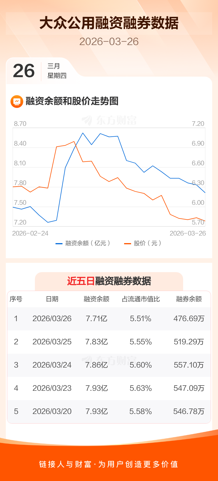 交易所最新数据显示,大众公用于2026年3月26日获融资买入1917.79万元,融资偿还3122.16万元,当日融资净偿还1204.38万元。目前,该股融资余额7.71亿,占流通市值比例为5.51%。