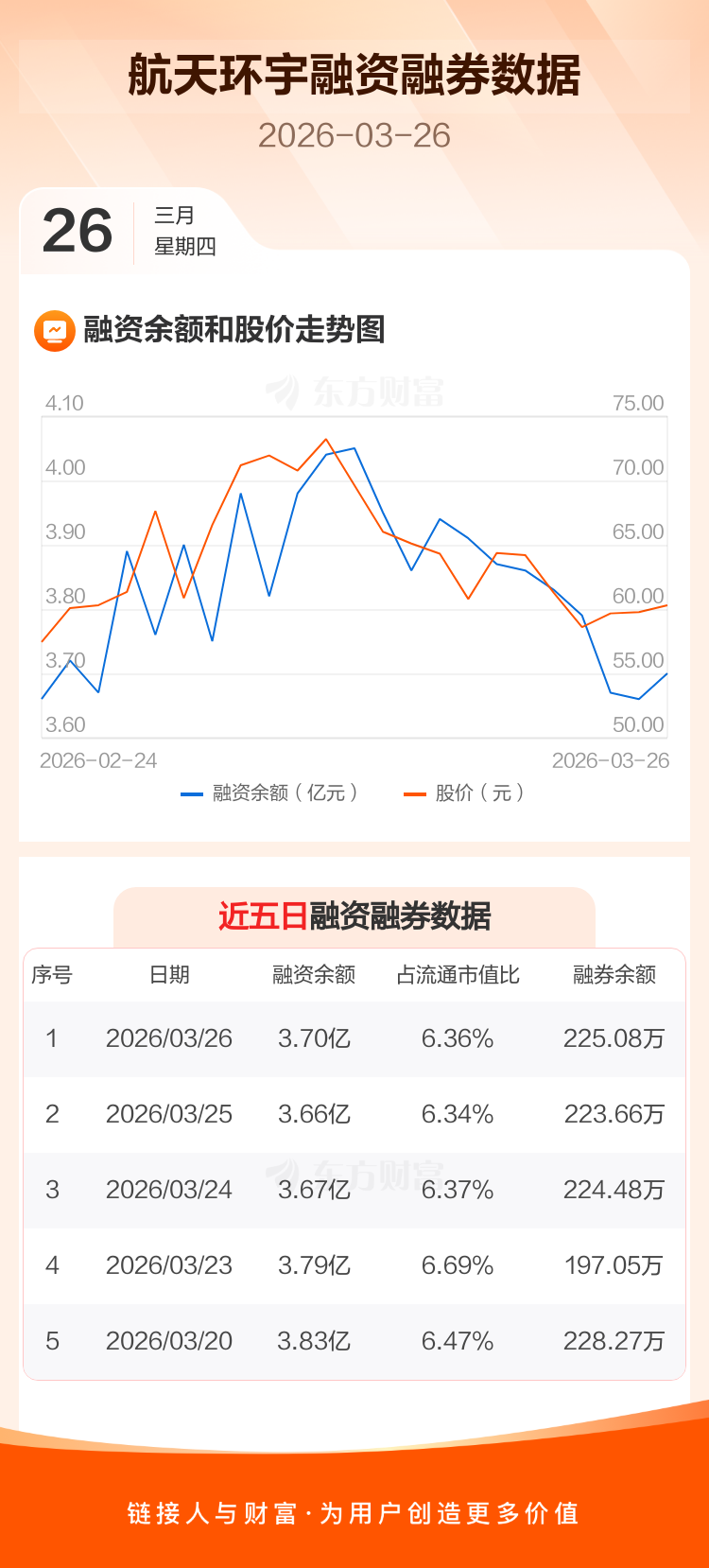 交易所最新数据显示,航天环宇于2026年3月26日获融资买入4201.25万元,融资偿还3743.26万元,当日融资净买入457.99万元。目前,该股融资余额3.70亿,占流通市值比例为6.36%。