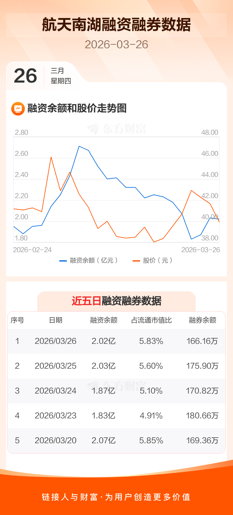 交易所最新数据显示,航天南湖于2026年3月26日获融资买入1773.47万元,融资偿还1835.10万元,当日融资净偿还61.63万元。目前,该股融资余额2.02亿,占流通市值比例为5.83%。