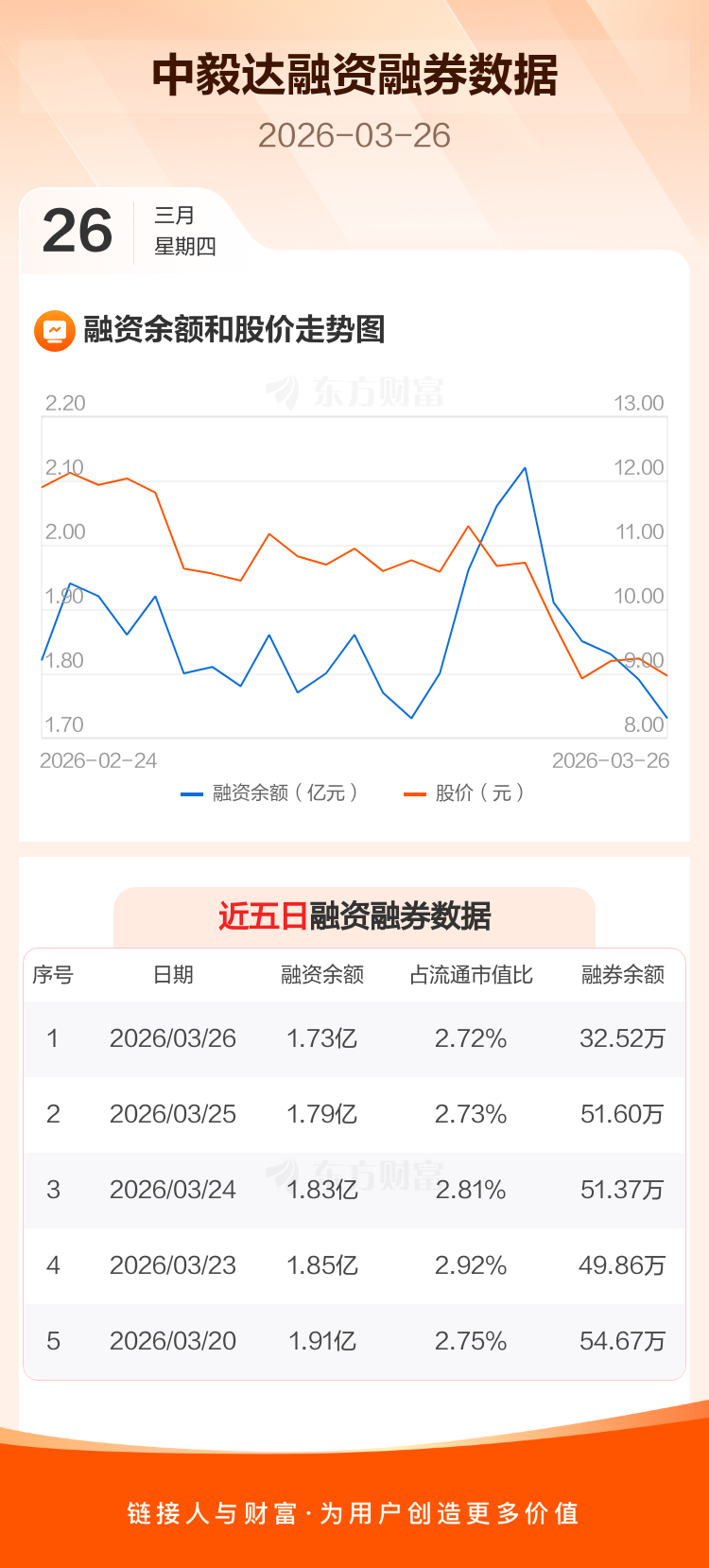 交易所最新数据显示,中毅达于2026年3月26日获融资买入991.39万元,融资偿还1618.58万元,当日融资净偿还627.18万元。目前,该股融资余额1.73亿,占流通市值比例为2.72%。