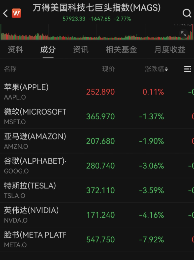 万得美国科技七巨头指数下跌2.77%。Meta领跌,跌幅近8%,英伟达跌超4%,特斯拉、谷歌母公司Alphabet跌超3%;亚马逊跌近2%,微软超1%。苹果为七巨头中唯一收涨个股,微涨0.11%。