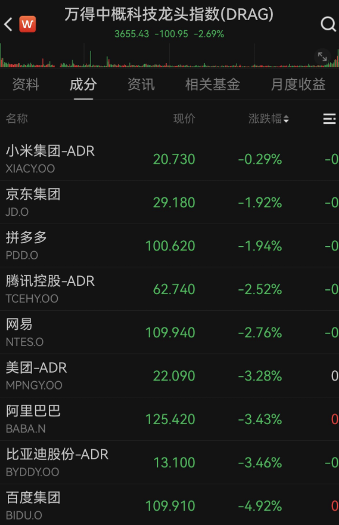 中概股普遍走低。纳斯达克中国金龙指数下跌2.55%,万得中概科技龙头指数跌2.69%。个股方面,百度集团跌近5%,比亚迪股份-ADR、阿里巴巴、美团-ADR跌超3%,网易、腾讯控股-ADR跌超2%,拼多多、京东集团跌近2%。
