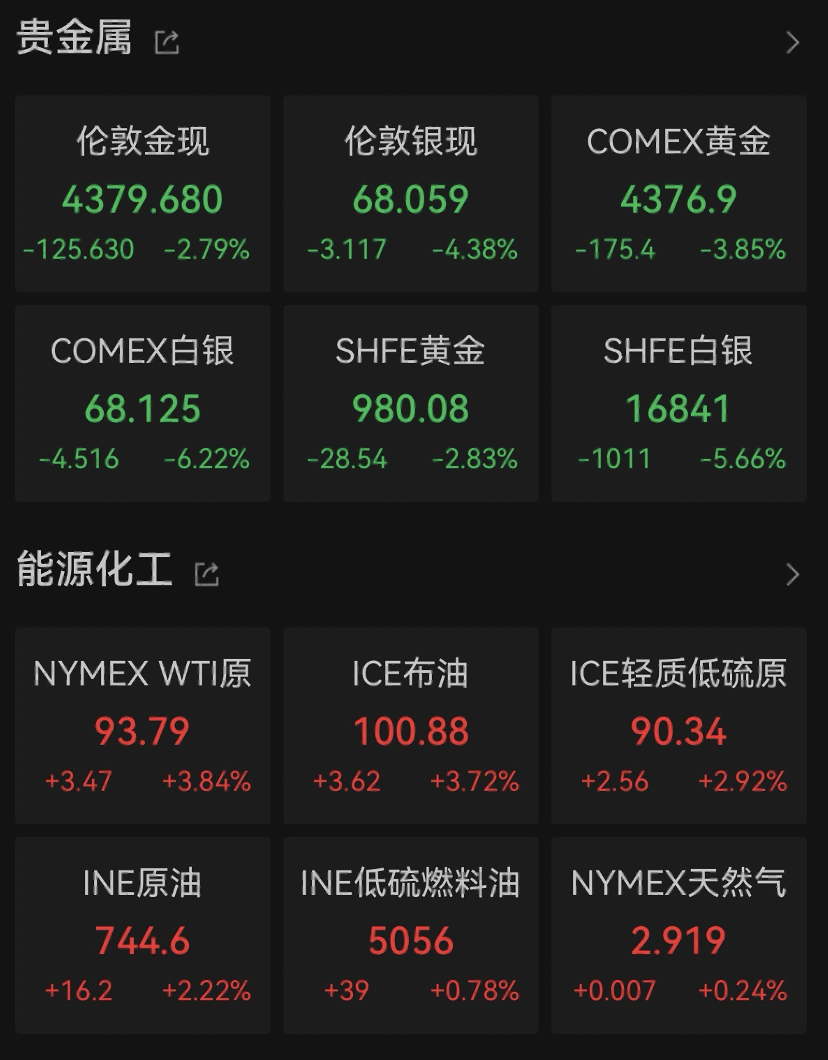 国际原油则走势相反,高位震荡。WTI原油期货涨3.84%,报93.79美元/桶;布伦特原油涨3.72%,报100.88美元/桶。