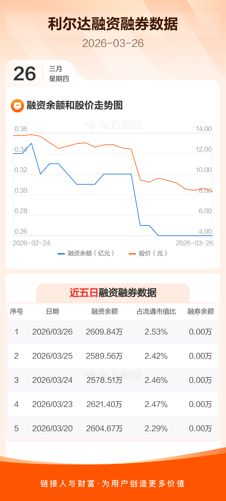 交易所最新数据显示,利尔达于2026年3月26日获融资买入40.75万元,融资偿还20.47万元,当日融资净买入20.28万元。目前,该股融资余额2609.84万,占流通市值比例为2.53%。