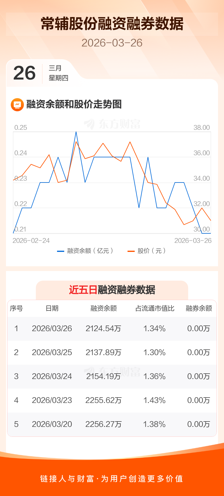 交易所最新数据显示,常辅股份于2026年3月26日获融资买入137.49万元,融资偿还150.84万元,当日融资净偿还13.35万元。目前,该股融资余额2124.54万,占流通市值比例为1.34%。