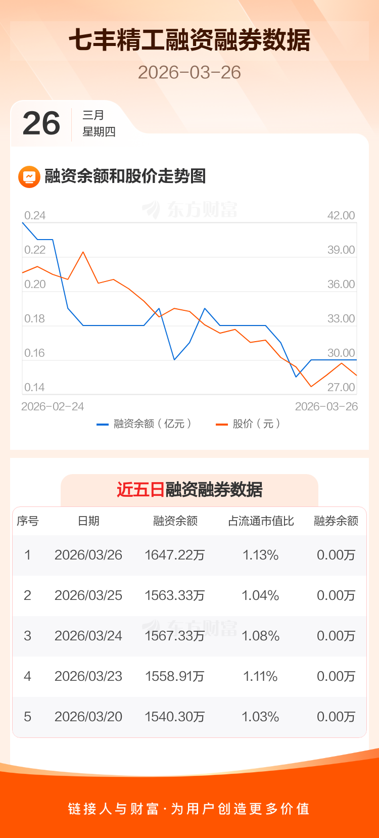 交易所最新数据显示,七丰精工于2026年3月26日获融资买入147.27万元,融资偿还63.38万元,当日融资净买入83.89万元。目前,该股融资余额1647.22万,占流通市值比例为1.13%。