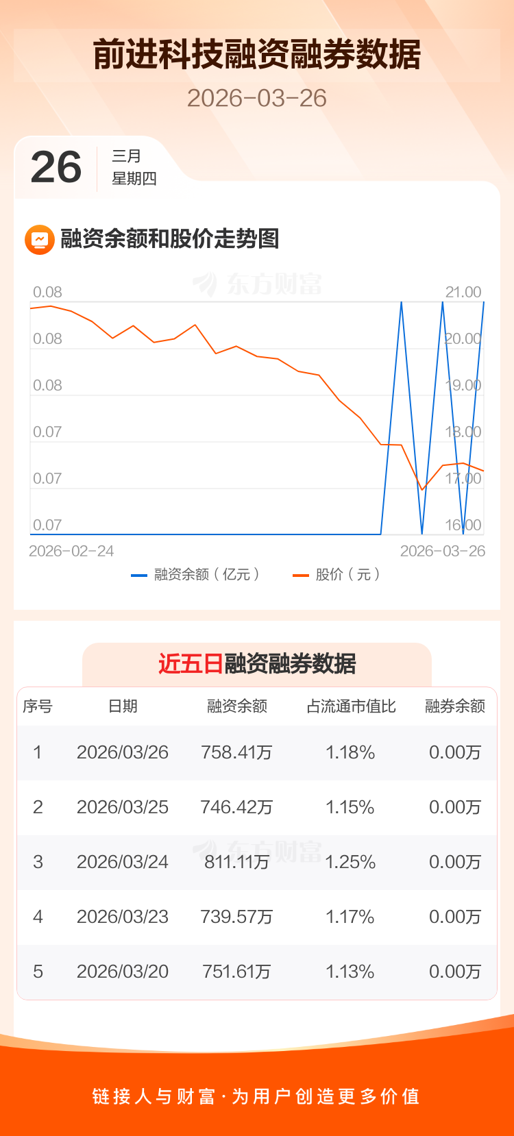 交易所最新数据显示,前进科技于2026年3月26日获融资买入32.90万元,融资偿还20.91万元,当日融资净买入11.99万元。目前,该股融资余额758.41万,占流通市值比例为1.18%。