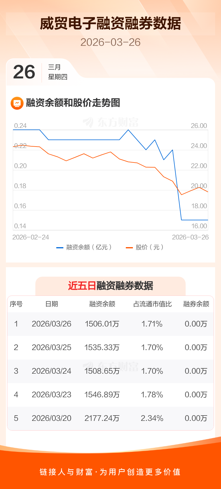 交易所最新数据显示,威贸电子于2026年3月26日获融资买入93.15万元,融资偿还122.47万元,当日融资净偿还29.32万元。目前,该股融资余额1506.01万,占流通市值比例为1.71%。