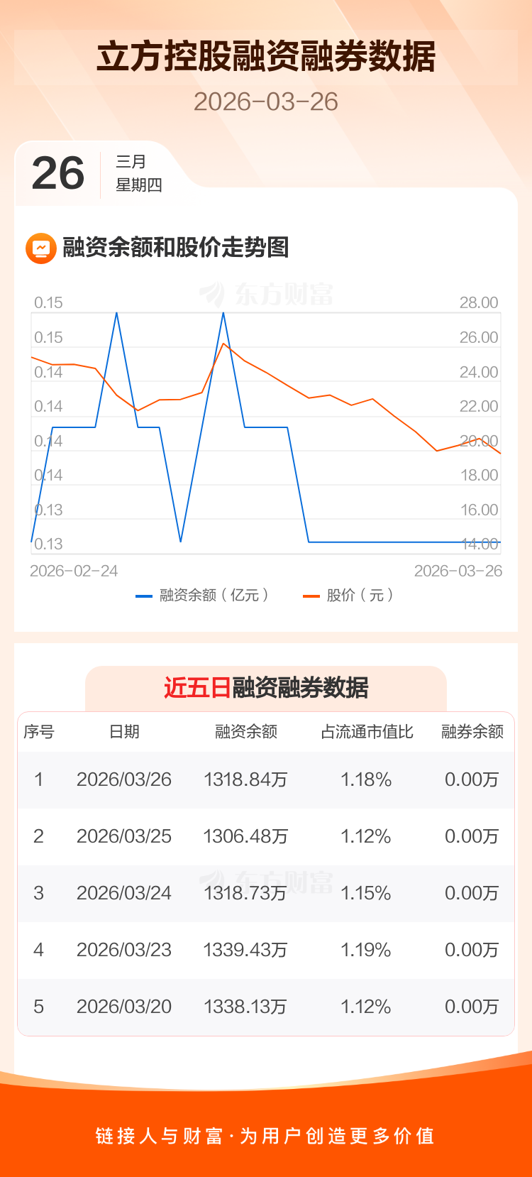 交易所最新数据显示,立方控股于2026年3月26日获融资买入14.05万元,融资偿还1.69万元,当日融资净买入12.36万元。目前,该股融资余额1318.84万,占流通市值比例为1.18%。