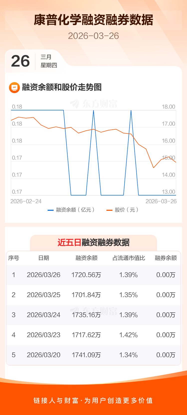 交易所最新数据显示,康普化学于2026年3月26日获融资买入21.64万元,融资偿还2.93万元,当日融资净买入18.72万元。目前,该股融资余额1720.56万,占流通市值比例为1.39%。