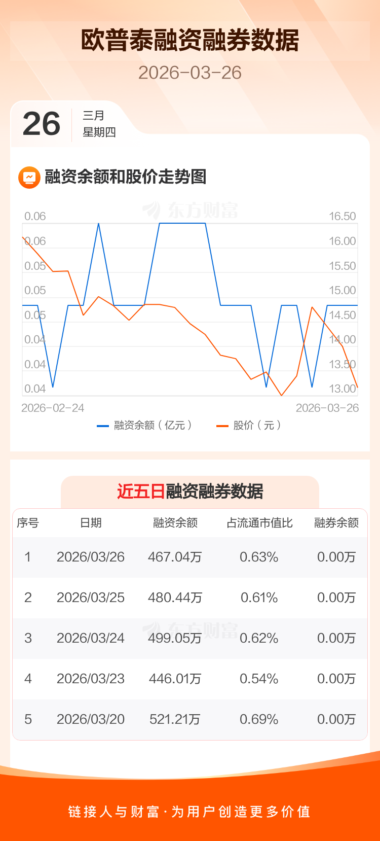 交易所最新数据显示,欧普泰于2026年3月26日获融资买入14.48万元,融资偿还27.89万元,当日融资净偿还13.41万元。目前,该股融资余额467.04万,占流通市值比例为0.63%。