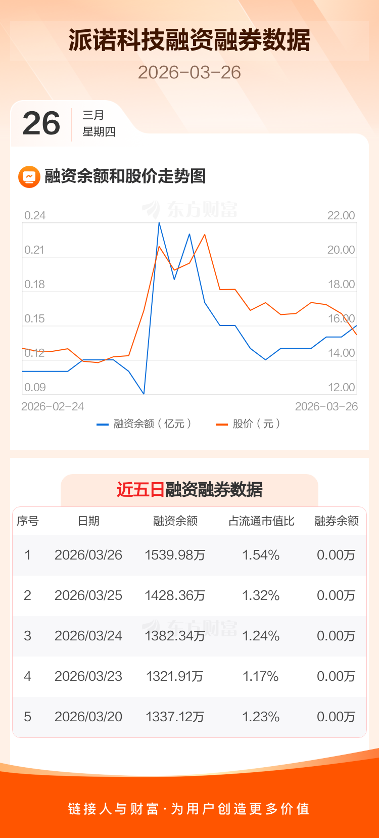 交易所最新数据显示,派诺科技于2026年3月26日获融资买入416.14万元,融资偿还304.52万元,当日融资净买入111.62万元。目前,该股融资余额1539.98万,占流通市值比例为1.54%。