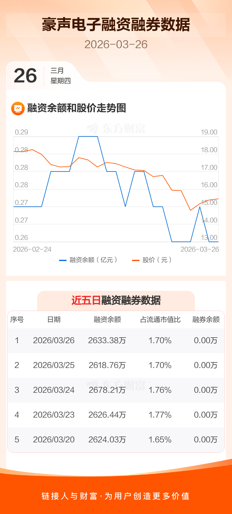 交易所最新数据显示,豪声电子于2026年3月26日获融资买入159.21万元,融资偿还144.59万元,当日融资净买入14.62万元。目前,该股融资余额2633.38万,占流通市值比例为1.70%。