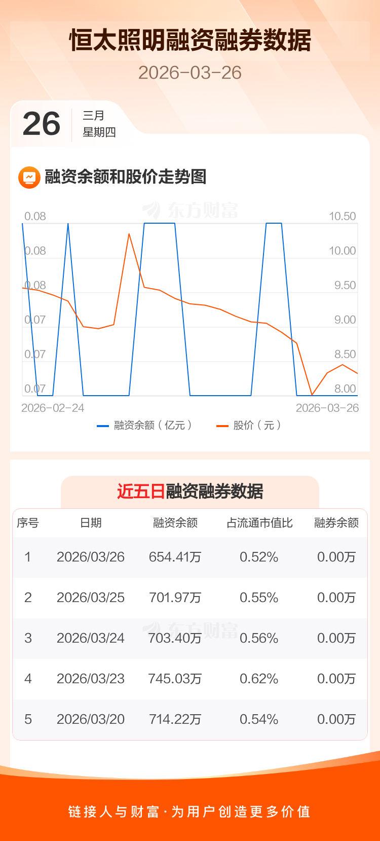 交易所最新数据显示,恒太照明于2026年3月26日获融资买入84.44万元,融资偿还132.00万元,当日融资净偿还47.56万元。目前,该股融资余额654.41万,占流通市值比例为0.52%。