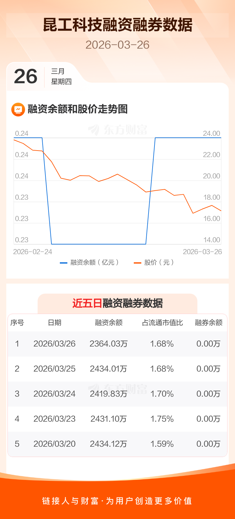 交易所最新数据显示,昆工科技于2026年3月26日获融资买入7.33万元,融资偿还77.31万元,当日融资净偿还69.98万元。目前,该股融资余额2364.03万,占流通市值比例为1.68%。