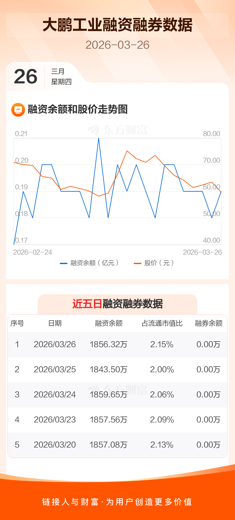 交易所最新数据显示,大鹏工业于2026年3月26日获融资买入92.18万元,融资偿还79.37万元,当日融资净买入12.82万元。目前,该股融资余额1856.32万,占流通市值比例为2.15%。
