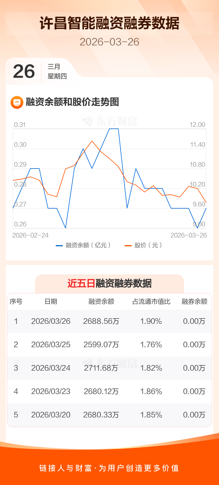 交易所最新数据显示,许昌智能于2026年3月26日获融资买入261.71万元,融资偿还172.22万元,当日融资净买入89.49万元。目前,该股融资余额2688.56万,占流通市值比例为1.90%。