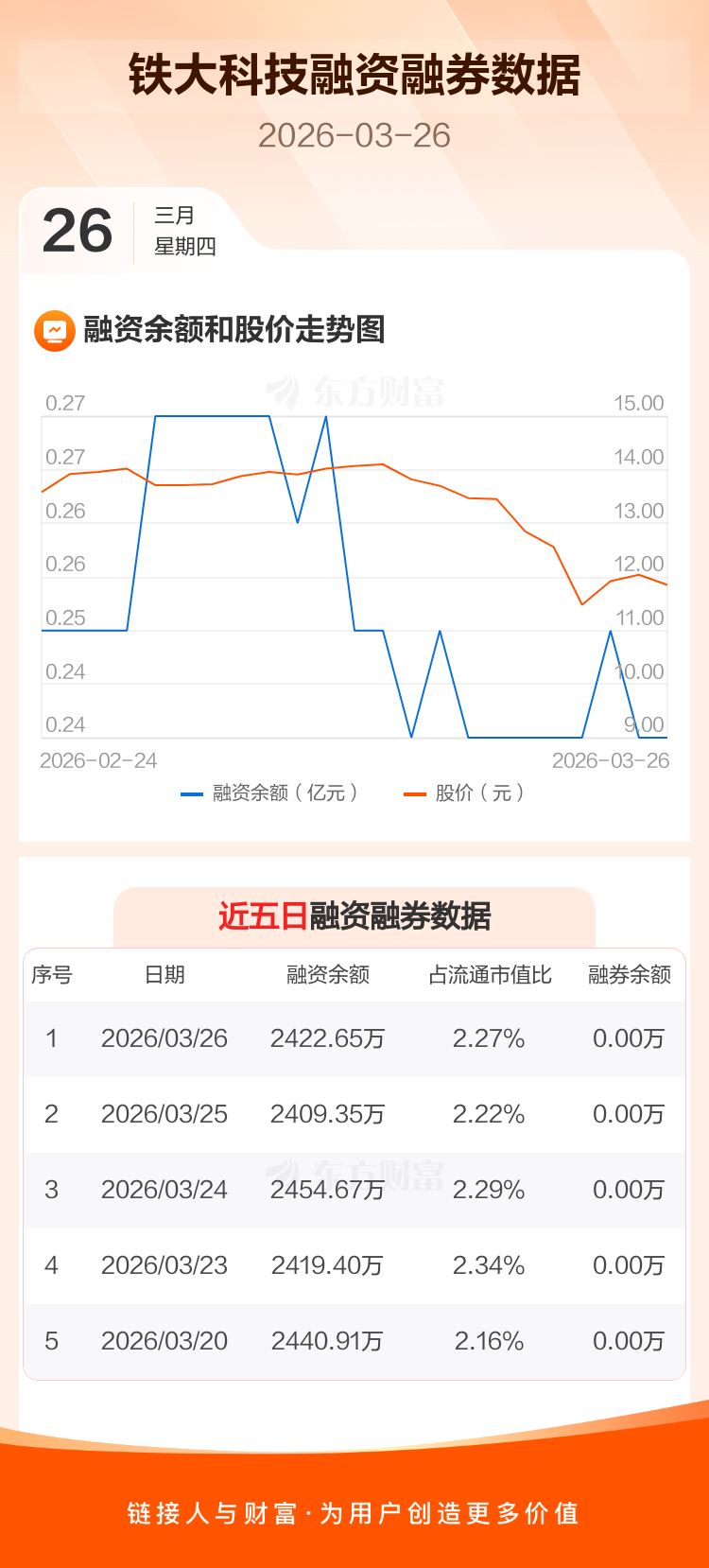 交易所最新数据显示,铁大科技于2026年3月26日获融资买入42.44万元,融资偿还29.15万元,当日融资净买入13.29万元。目前,该股融资余额2422.65万,占流通市值比例为2.27%。