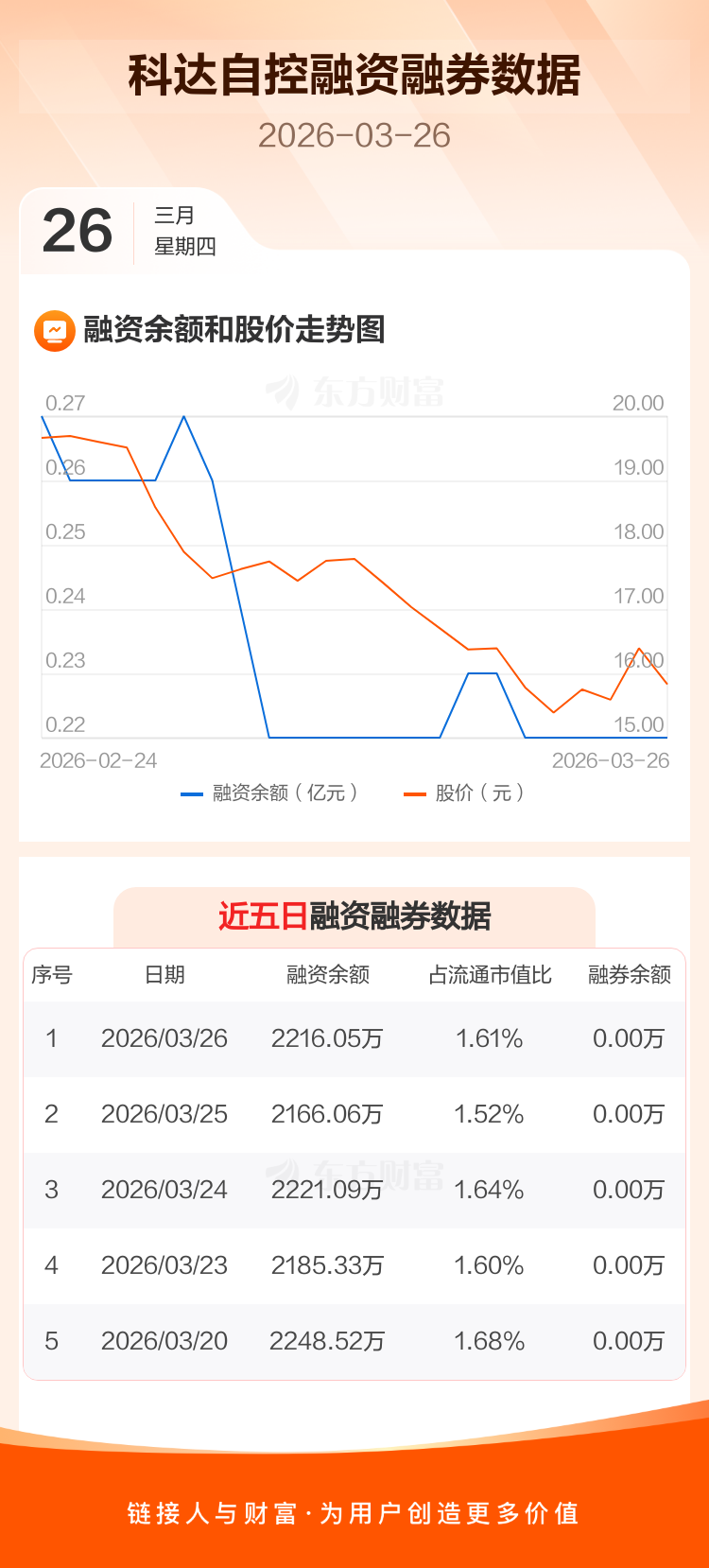 交易所最新数据显示,科达自控于2026年3月26日获融资买入70.65万元,融资偿还20.67万元,当日融资净买入49.98万元。目前,该股融资余额2216.05万,占流通市值比例为1.61%。