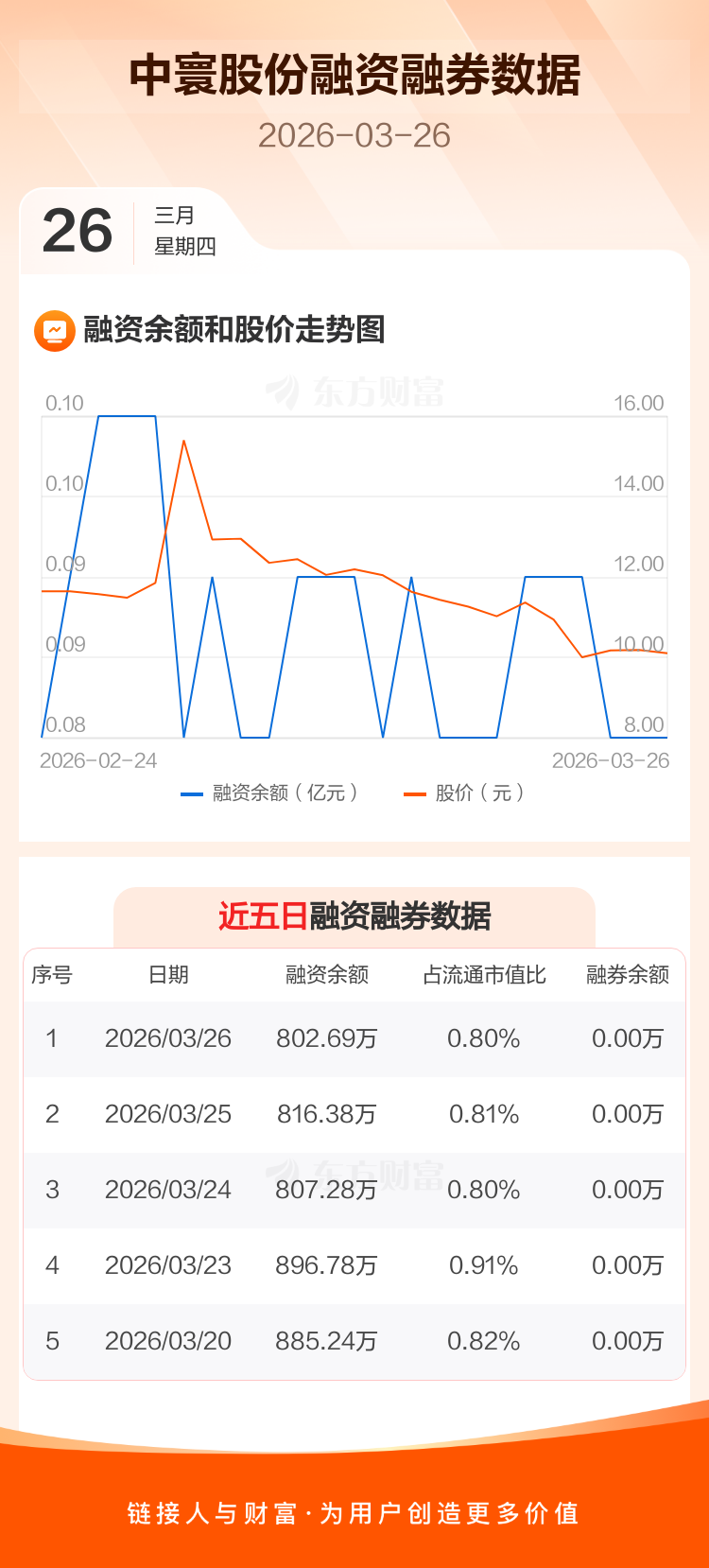 交易所最新数据显示,中寰股份于2026年3月26日获融资买入54.32万元,融资偿还68.01万元,当日融资净偿还13.69万元。目前,该股融资余额802.69万,占流通市值比例为0.80%。