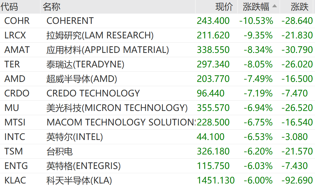 COHERENT大跌10.53%,拉姆研究跌9.35%,应用材料跌8.34%,泰瑞达跌8.05%,超威半导体跌7.49%,美光科技跌6.94%,英特尔跌6.53%,台积电跌6.20%。