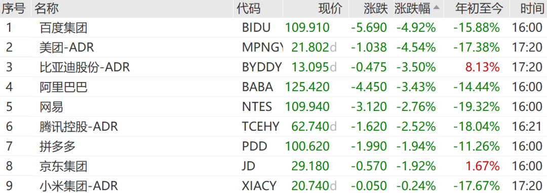 百度集团跌4.92%,美团跌4.54%,比亚迪股份跌3.50%,领跌万得中概科技龙头指数成份股。