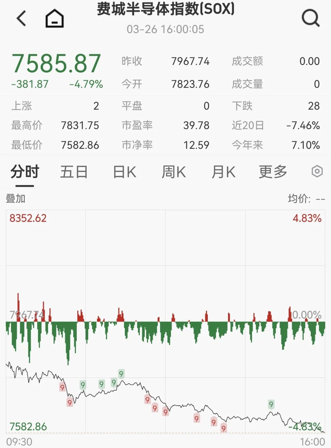 芯片股应声下跌。费城半导体指数跌4.79%。