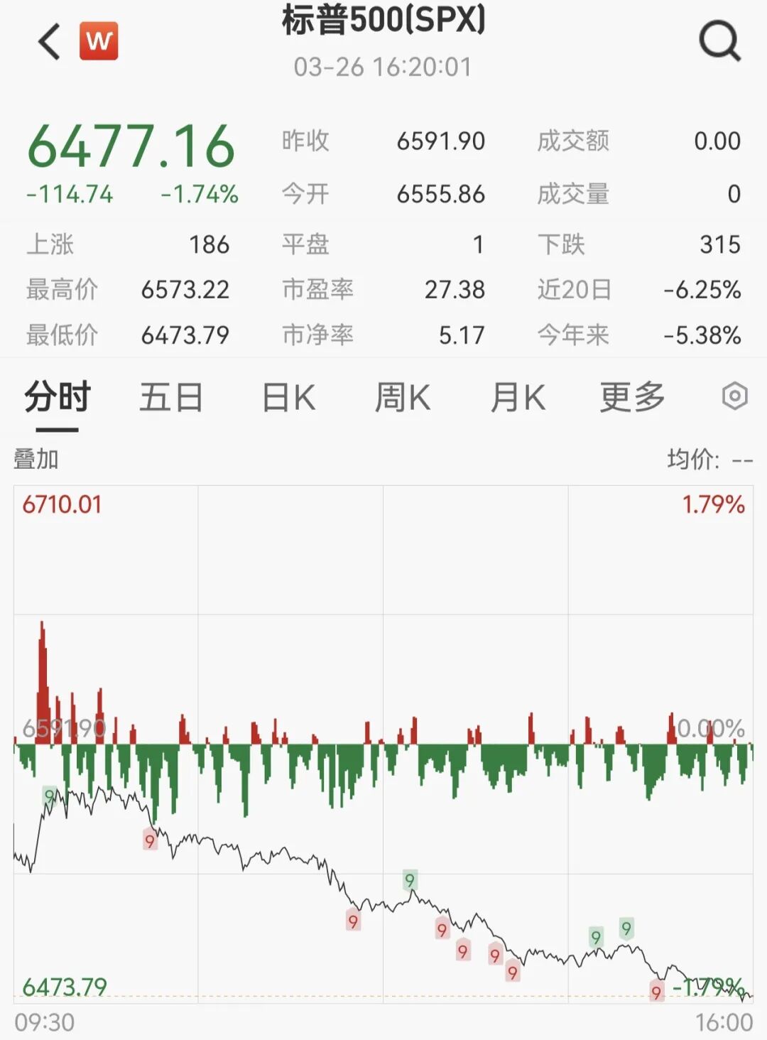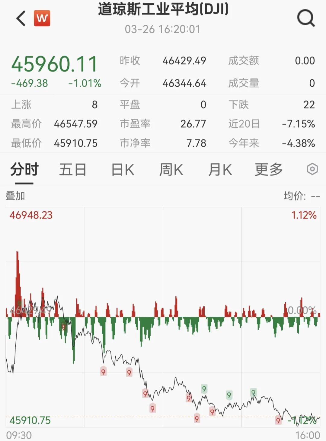 3月26日,美国三大股指全线收跌,道指跌1.01%,报45960.11点;标普500指数跌1.74%,报6477.16点;纳指跌2.38%,报21408.08点。