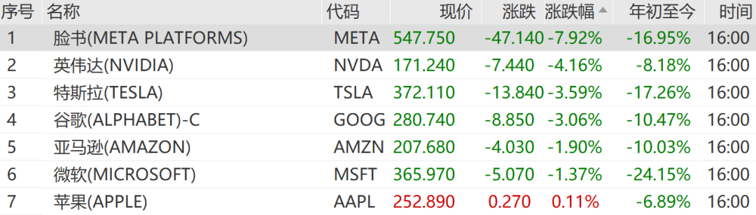 脸书(Meta)跌7.92%,英伟达跌4.16%,特斯拉跌3.59%,领跌万得美国科技七巨头。