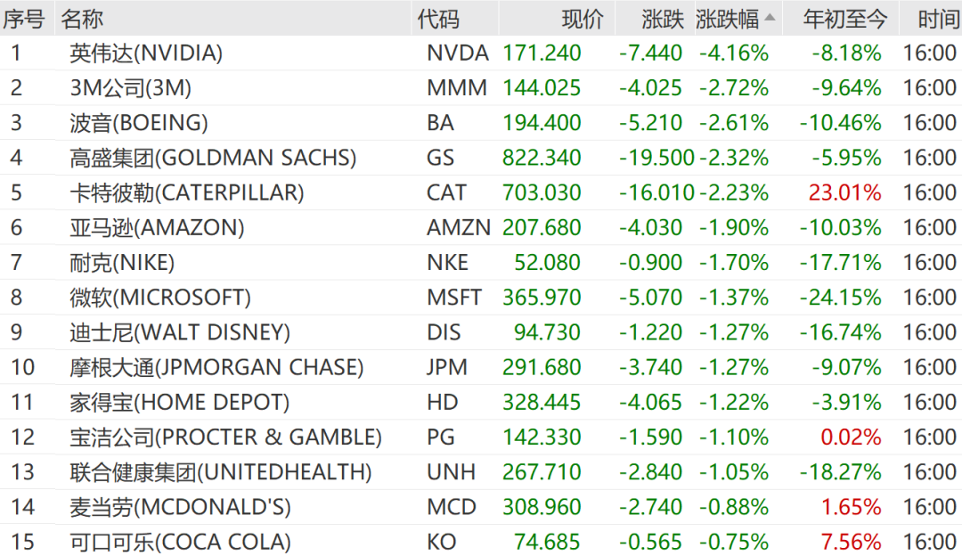 英伟达跌4.16%,3M公司跌2.72%,波音跌2.61%,领跌道指成份股。