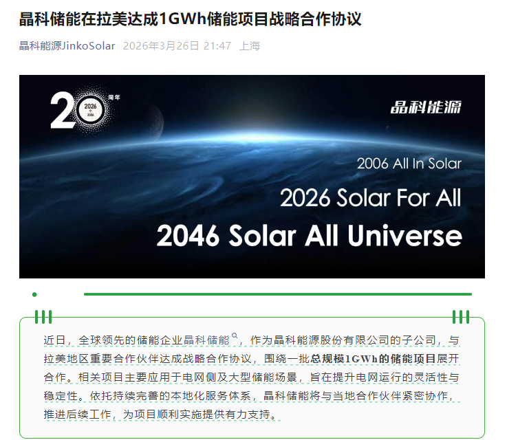 3月26日,据晶科能源消息,近日,公司子公司晶科储能与拉美地区重要合作伙伴达成战略合作协议,围绕一批总规模1GWh的储能项目展开合作。相关项目主要应用于电网侧及大型储能场景,旨在提升电网运行的灵活性与稳定性。