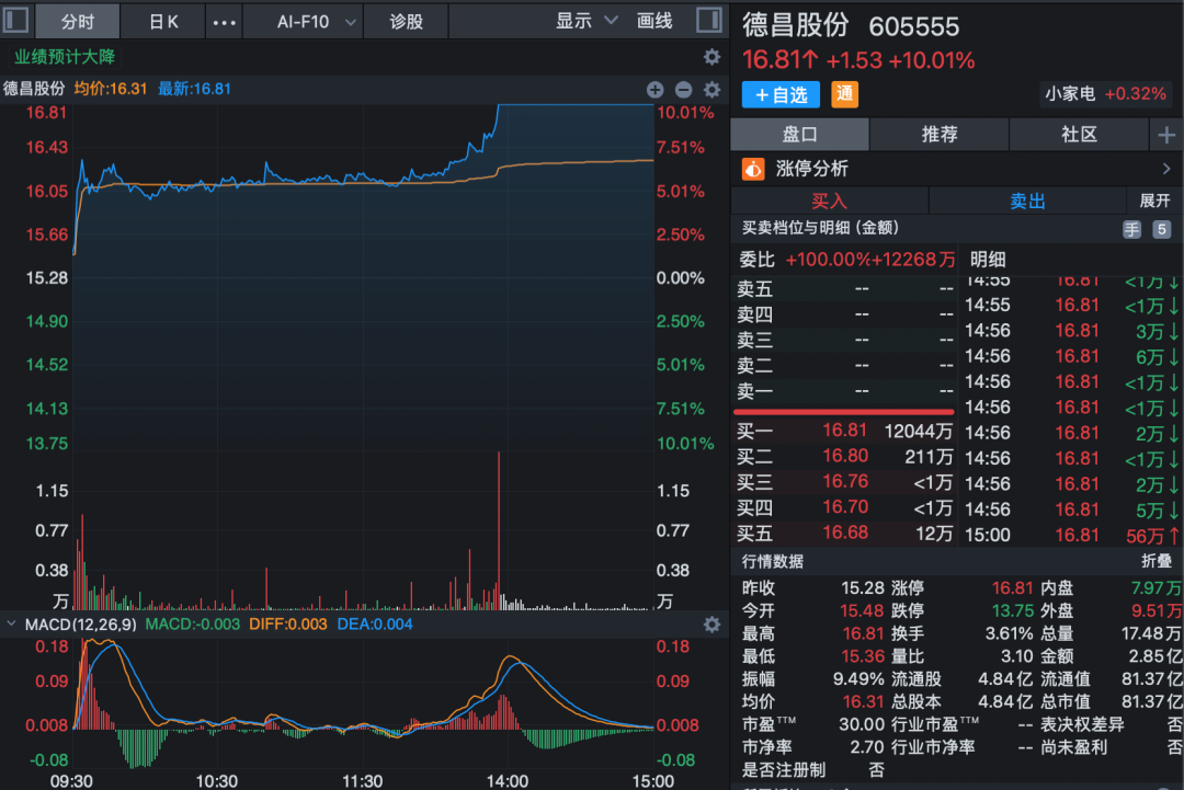 3月26日,德昌股份股价在午后封涨停板,封单金额达到1.2亿元,最新总市值约81亿元。