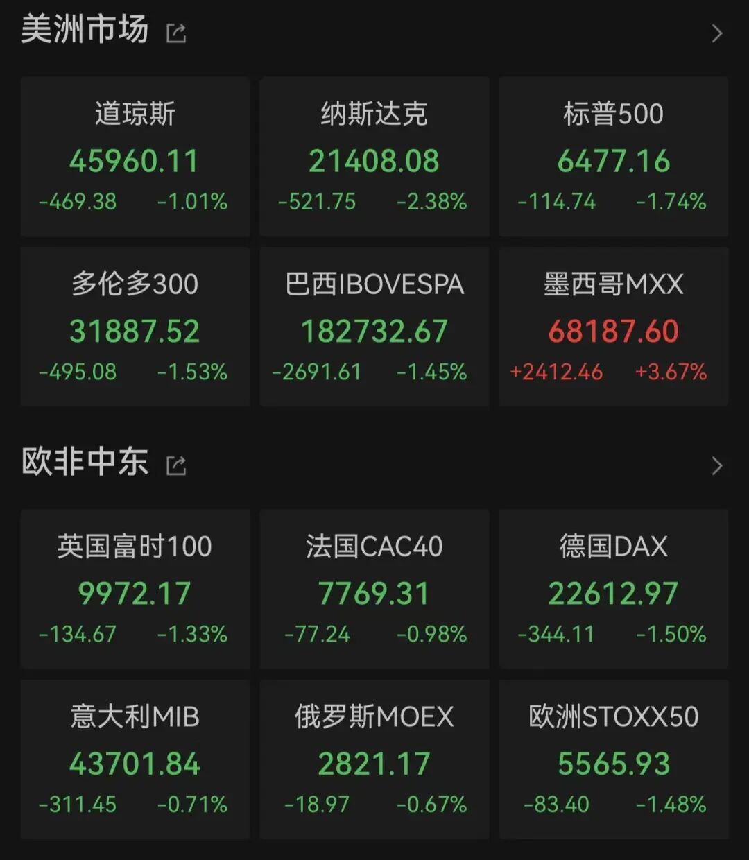 欧洲三大股指收盘全线下跌。德国DAX指数跌1.5%报22612.97点,法国CAC40指数跌0.98%报7769.31点,英国富时100指数跌1.33%报9972.17点。