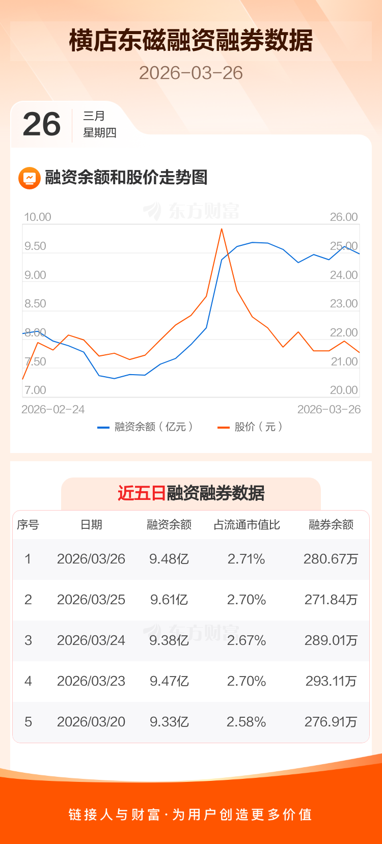 交易所最新数据显示,横店东磁于2026年3月26日获融资买入6287.07万元,融资偿还7582.14万元,当日融资净偿还1295.06万元。目前,该股融资余额9.48亿,占流通市值比例为2.71%。