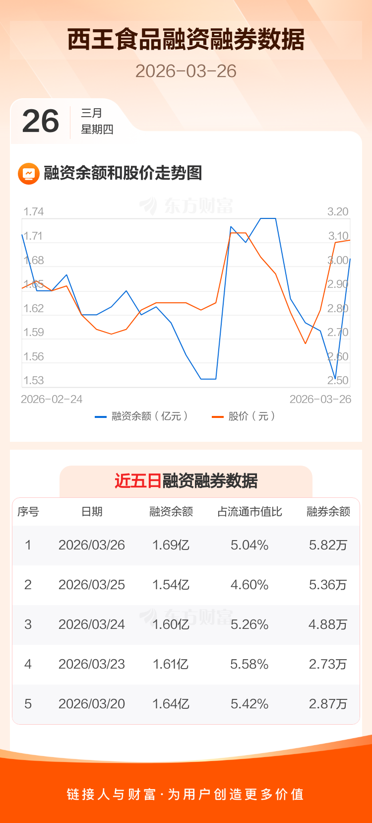 交易所最新数据显示,西王食品于2026年3月26日获融资买入4261.48万元,融资偿还2711.97万元,当日融资净买入1549.52万元。目前,该股融资余额1.69亿,占流通市值比例为5.04%。