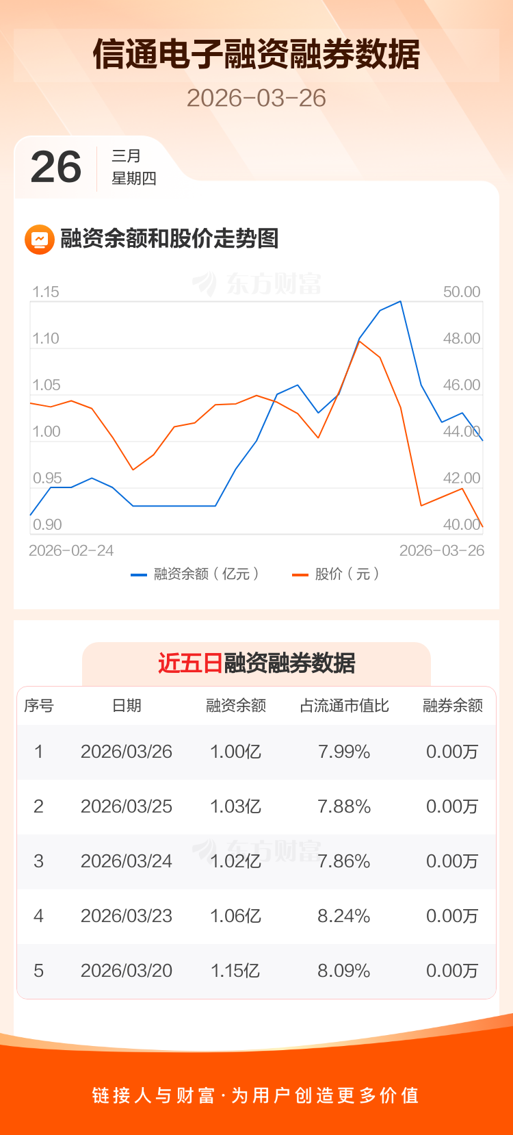 交易所最新数据显示,信通电子于2026年3月26日获融资买入695.96万元,融资偿还969.83万元,当日融资净偿还273.87万元。目前,该股融资余额1.00亿,占流通市值比例为7.99%。