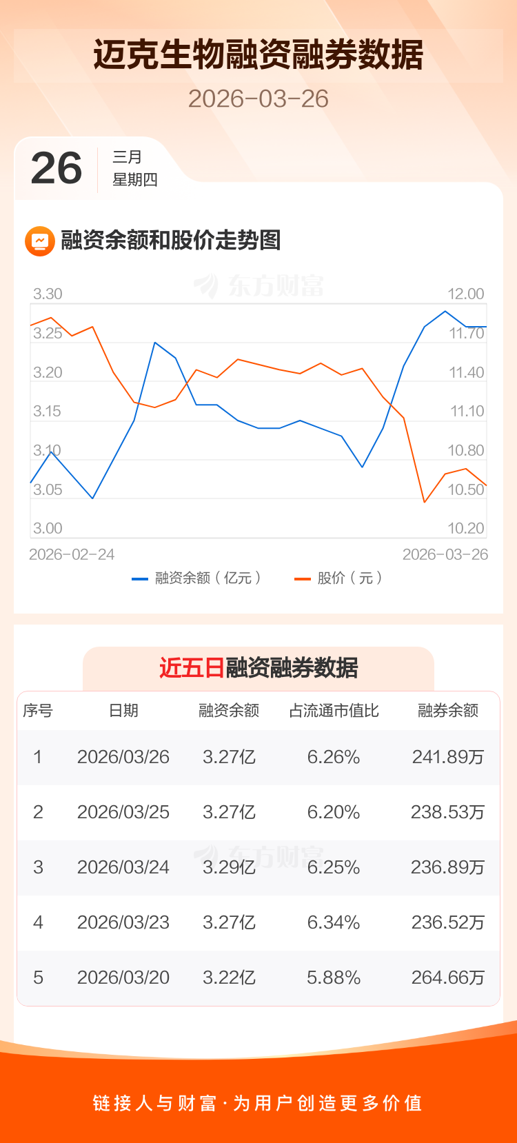 交易所最新数据显示,迈克生物于2026年3月26日获融资买入730.47万元,融资偿还803.01万元,当日融资净偿还72.54万元。目前,该股融资余额3.27亿,占流通市值比例为6.26%。