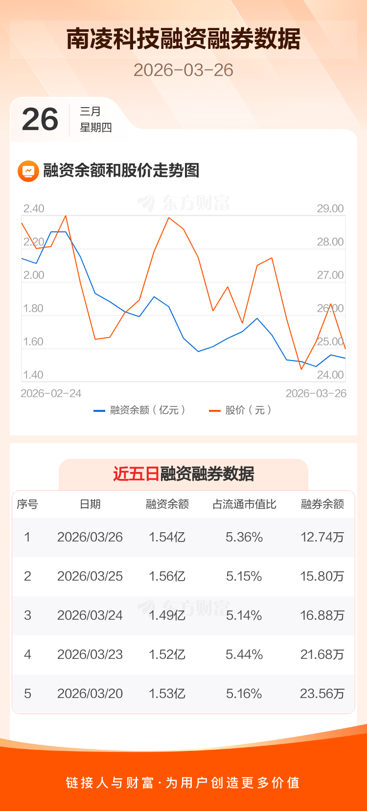 交易所最新数据显示,南凌科技于2026年3月26日获融资买入1735.75万元,融资偿还1937.04万元,当日融资净偿还201.29万元。目前,该股融资余额1.54亿,占流通市值比例为5.36%。