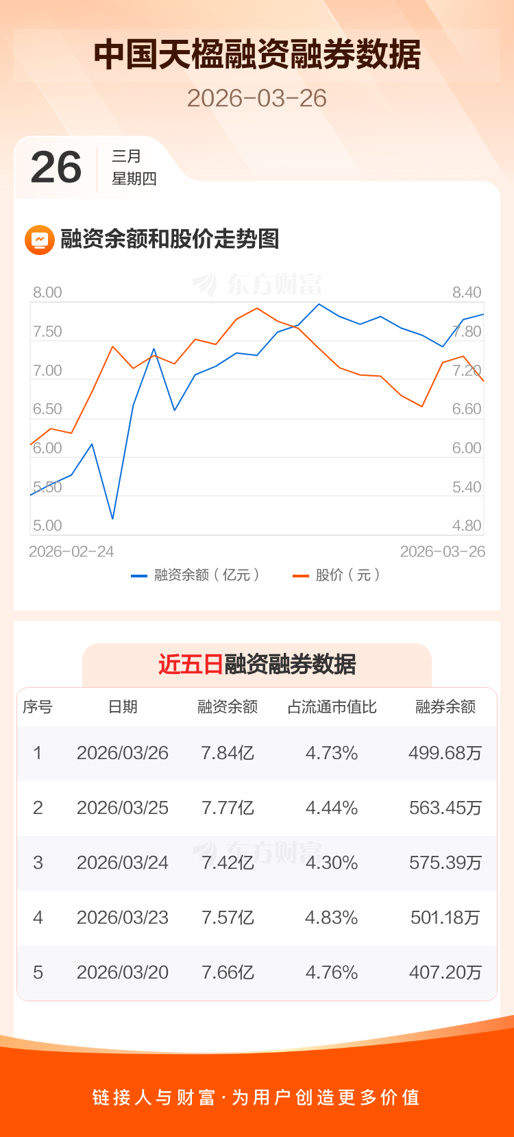 交易所最新数据显示,中国天楹于2026年3月26日获融资买入8217.21万元,融资偿还7517.09万元,当日融资净买入700.12万元。目前,该股融资余额7.84亿,占流通市值比例为4.73%。