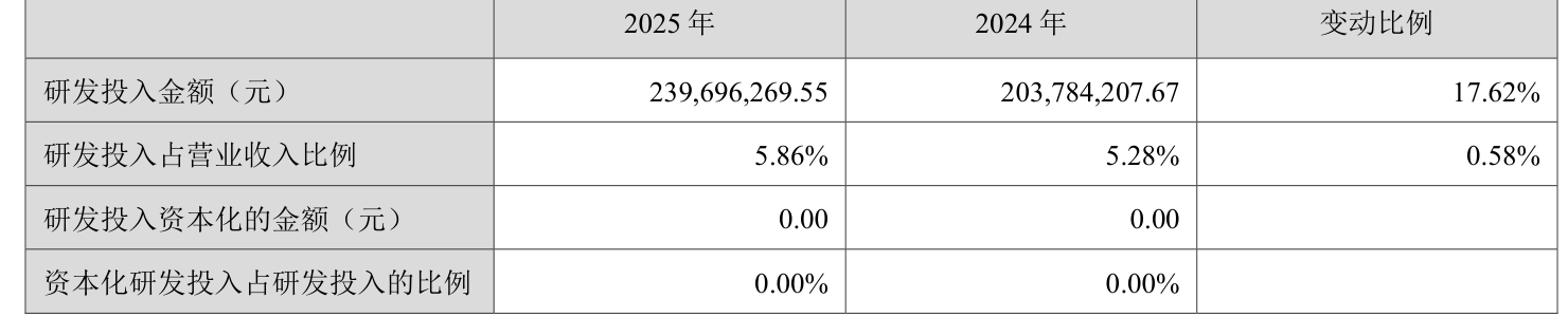 2025年全年,公司研发投入金额为2.4亿元,同比增长17.62%;研发投入占营业收入比例为5.86%,相比上年同期上升0.58个百分点。此外,公司全年研发投入资本化率为0%。