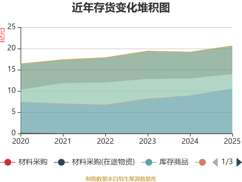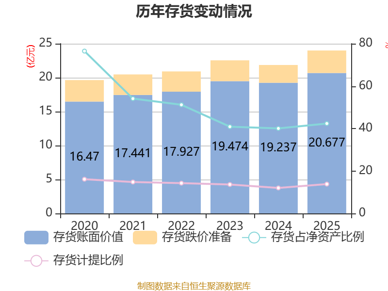 从存货变动来看,截至2025年末,公司存货账面价值为20.68亿元,占净资产的42.36%,较上年末增加1.44亿元。其中,存货跌价准备为3.31亿元,计提比例为13.82%。