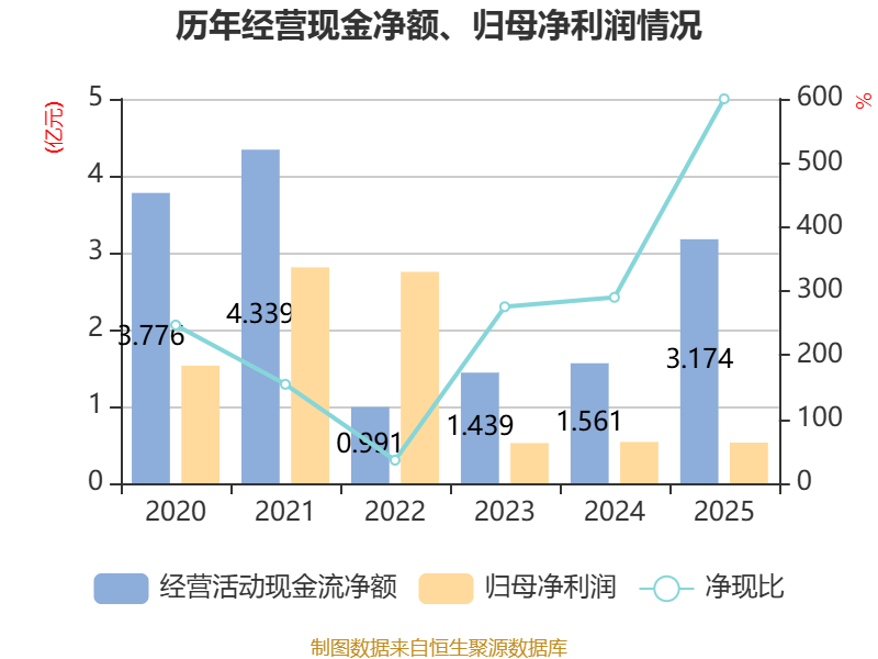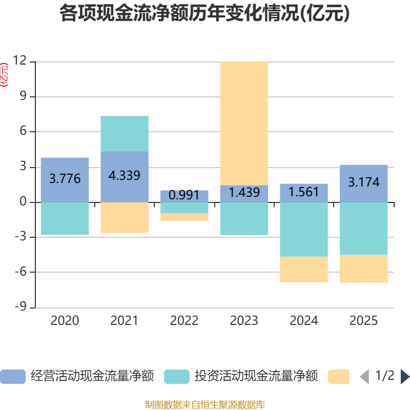 截至2025年,公司经营活动现金流净额为3.17亿元,同比增长103.34%;筹资活动现金流净额-2.36亿元,同比减少1758.46万元;投资活动现金流净额-4.52亿元,上年同期为-4.66亿元。
