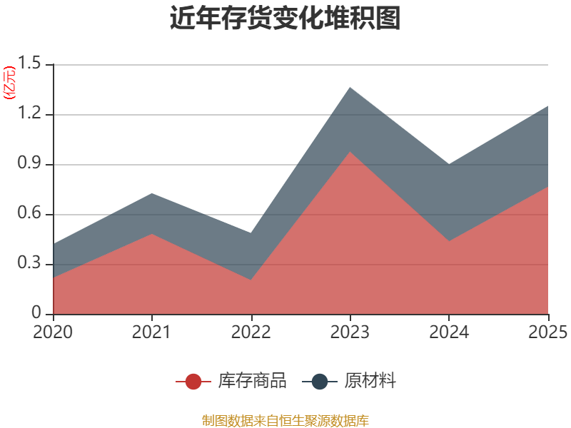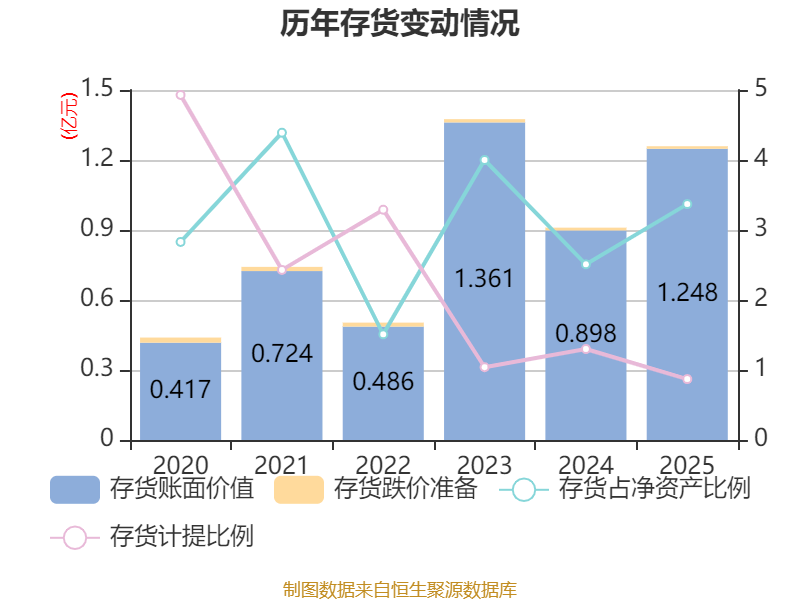 从存货变动来看,截至2025年末,公司存货账面价值为1.25亿元,占净资产的3.37%,较上年末增加3497.79万元。其中,存货跌价准备为109.43万元,计提比例为0.87%。