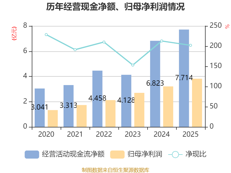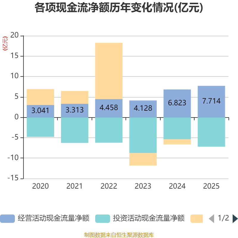 截至2025年,公司经营活动现金流净额为7.71亿元,同比增长13.05%;筹资活动现金流净额40.93万元,同比增加1.26亿元;投资活动现金流净额-7.2亿元,上年同期为-5.4亿元。