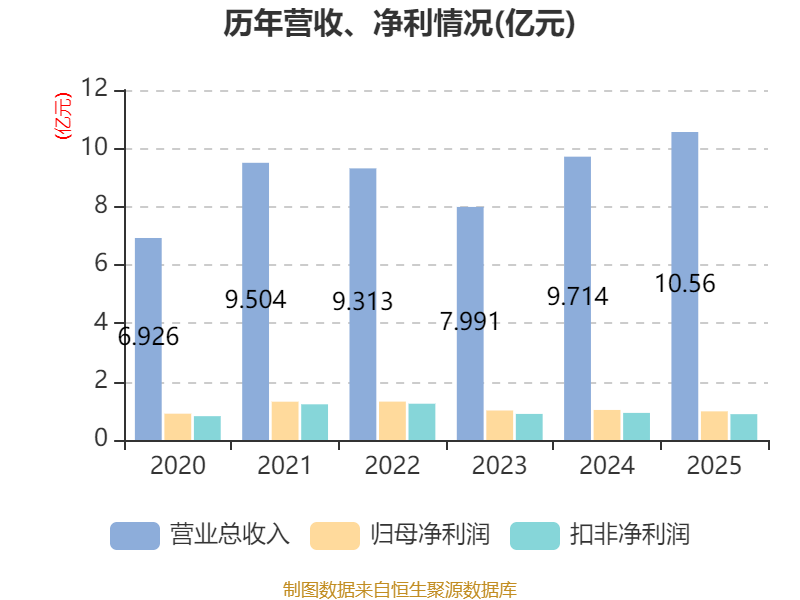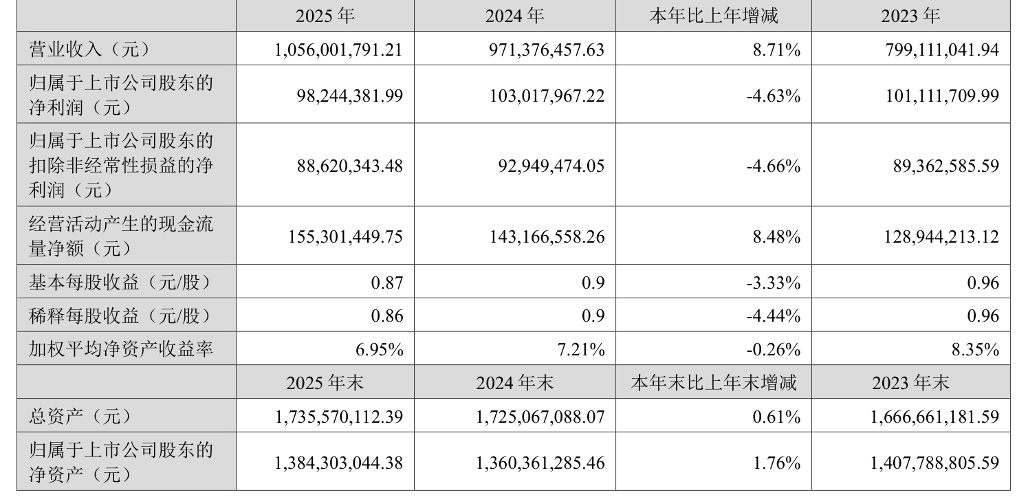 中证智能财讯通达创智(001368)3月27日披露2025年年度报告。2025年,公司实现营业总收入10.56亿元,同比增长8.71%;归母净利润9824.44万元,同比下降4.63%;扣非净利润8862.03万元,同比下降4.66%;经营活动产生的现金流量净额为1.55亿元,同比增长8.48%;报告期内,通达创智基本每股收益为0.87元,加权平均净资产收益率为6.95%。公司2025年度分配预案为:拟向全体股东每10股派现1.5元(含税)。